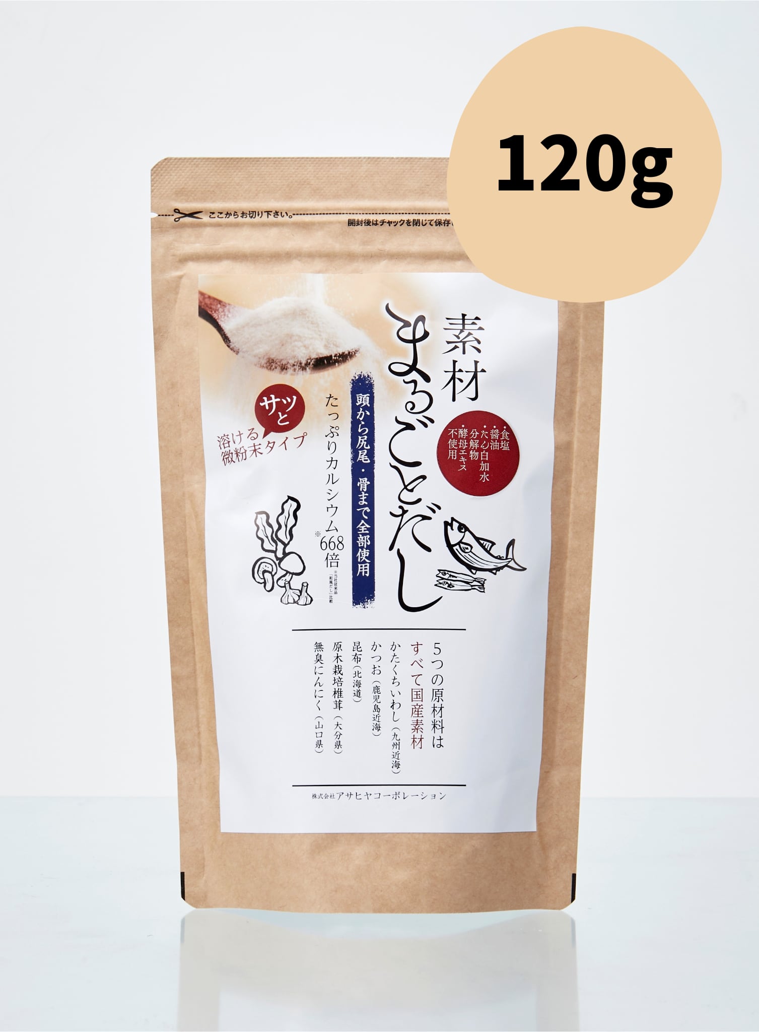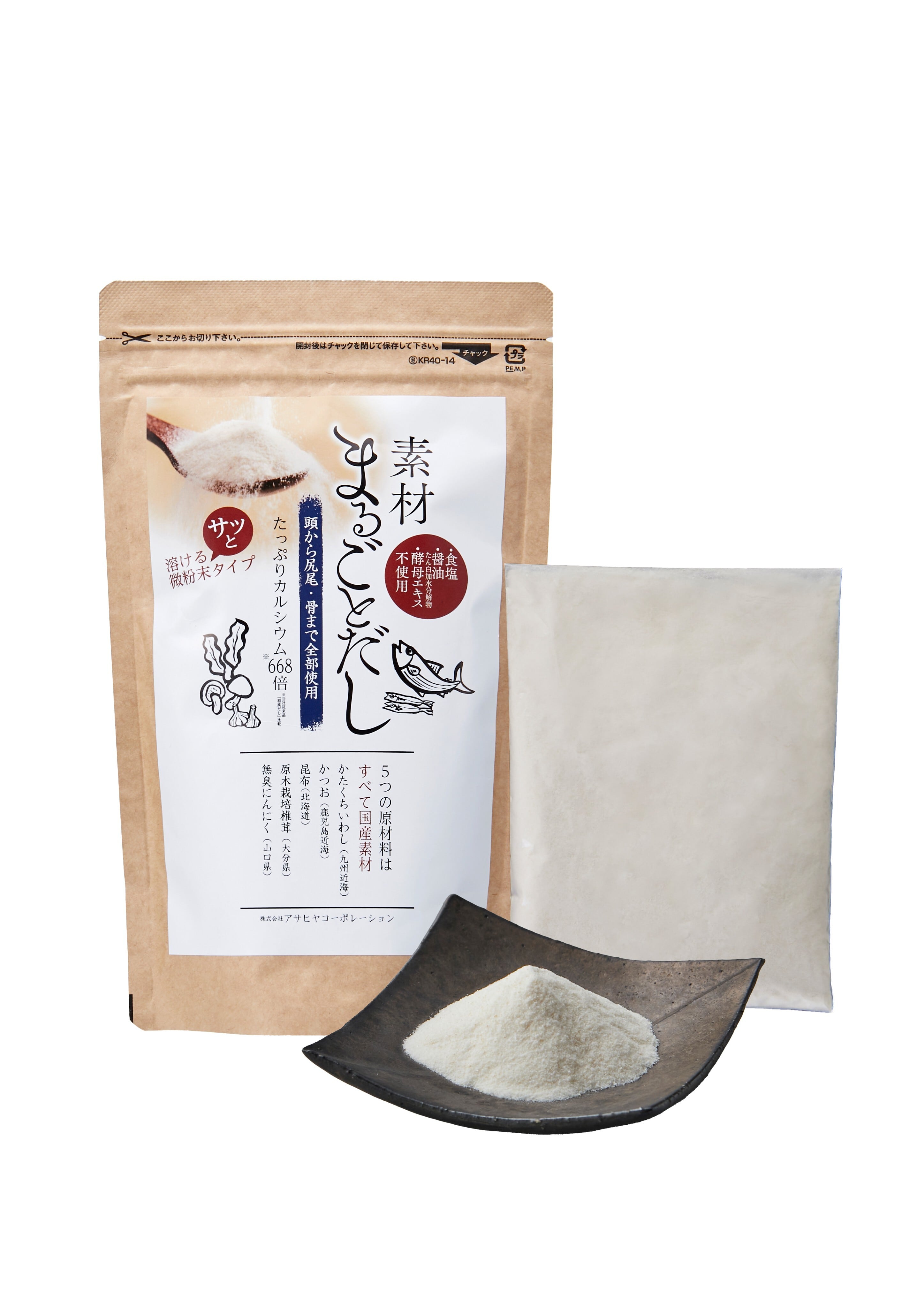 塩・保存料・うま味調味料・人工甘味料・酵母エキス・たん白加水分解物・砂糖・醤油・酸化防止剤等を一切使用せず、原料を丸々粉末化した無添加だしです。